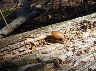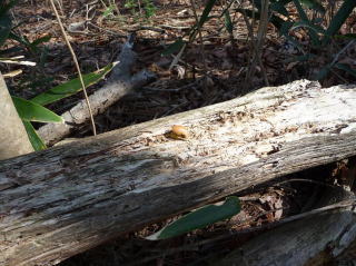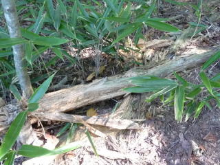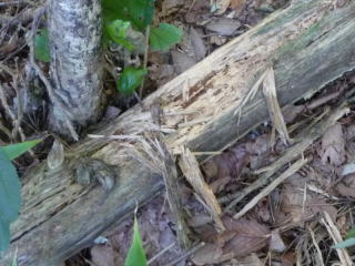 | ドングリ坊やを心にとめたおじさんでしたが、一月もするとすっかり忘れてしまいました。ところが、ドングリの話を聞いていた千葉に住む心やさしいおじさんは忘れていませんでした。ドングリの行方をいつも気にしていましたが、その後の様子がなかなか伝わってきません。 そこで、心やさしいおじさんは、忘れっぽいおじさんに「ドングリは元気にしていますか」と、尋ねてみました。尋ねられたおじさんは、ドングリの行方が少し気になりましたが、「大丈夫」と、すっかり安心しきっていました。 「さて、そろそろドングリの様子を見に行くか。だいぶ大きくなっただろう」と、思い立ったのは夏も過ぎた秋になってからでした。ドングリ坊やの場所を訪ねてビックリ!!跡かたもありません。「しまった、油断した」と思っても後の祭り。 周りを見渡すとドングリ坊やが乗っていた枯れ木は、乱暴に引きちぎられています。木の中の虫を探してクマが大きな爪で引きちぎったに違いありません。 |